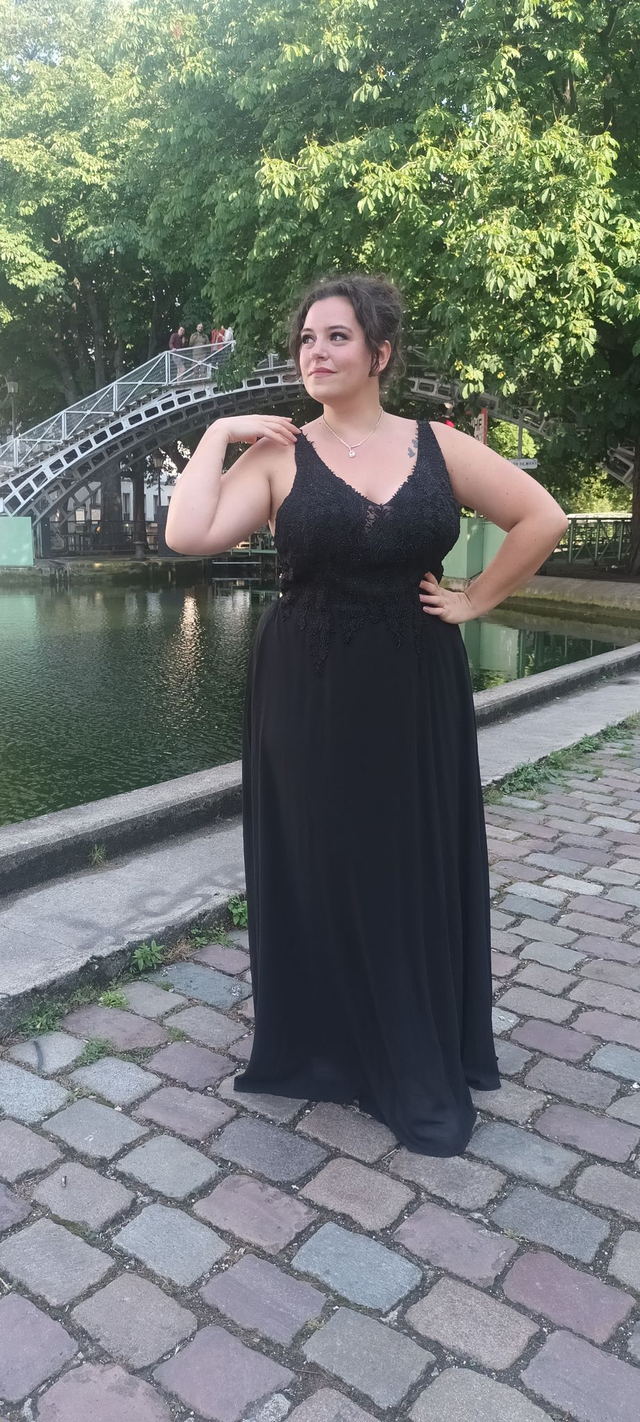 Cette robe longue noire incarne la grâce et la confiance. Avec son bustier en dentelle finement travaillé et sa jupe fluide en mousseline, elle dessine une silhouette féminine, libre et élégante. Les bretelles fines et le décolleté en V soulignent subtilement le haut du corps tandis que la jupe longue tombe avec légèreté pour un effet à la fois raffiné et naturel.