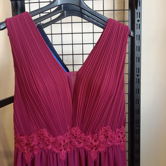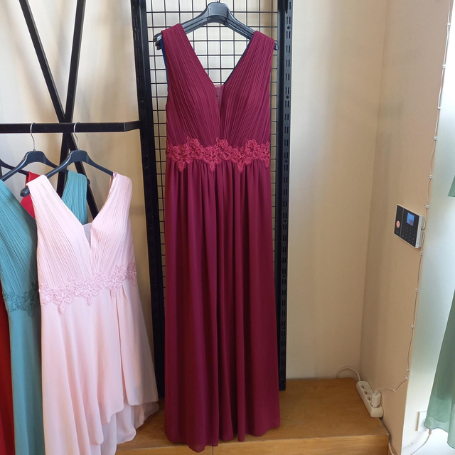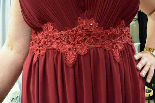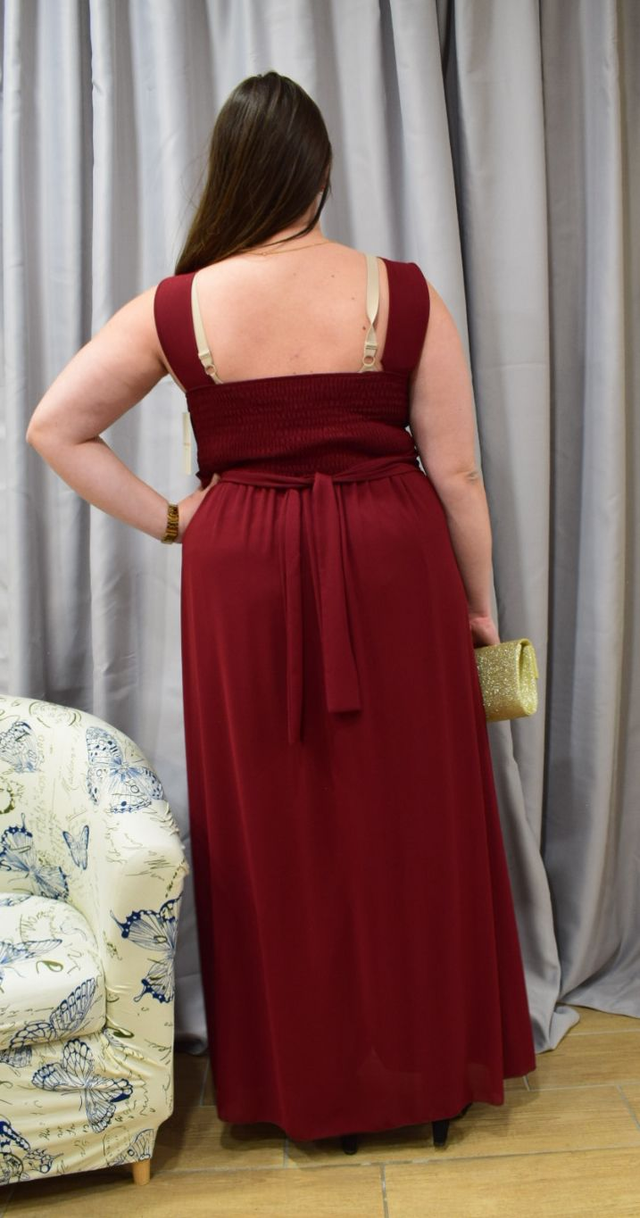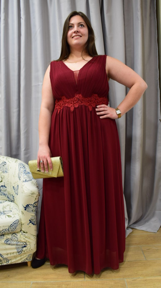 Cette robe longue en mousseline bordeaux sublime la silhouette avec un plissé délicat sur le buste et une ceinture en dentelle florale ton sur ton qui marque élégamment la taille. Le décolleté en V met en valeur le port de tête, tandis que le tombé fluide allonge la ligne du corps. Pensée pour les morphologies généreuses, cette création allie maintien, confort et allure. Associée à une pochette dorée scintillante, elle incarne une féminité confiante et raffinée, prête à briller pour une cérémonie ou un grand soir.