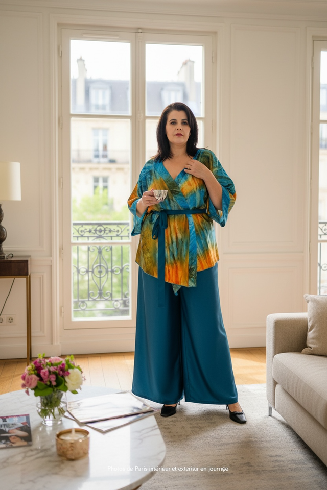 Ce kimono Cousu Soie en soie naturelle aux couleurs vibrantes est une pièce forte, pensée pour sublimer les silhouettes du 44 au 56. Sa coupe ample et fluide offre un confort irréprochable, tandis que sa forme portefeuille permet d’ajuster facilement le tombé grâce à sa ceinture ton sur ton.