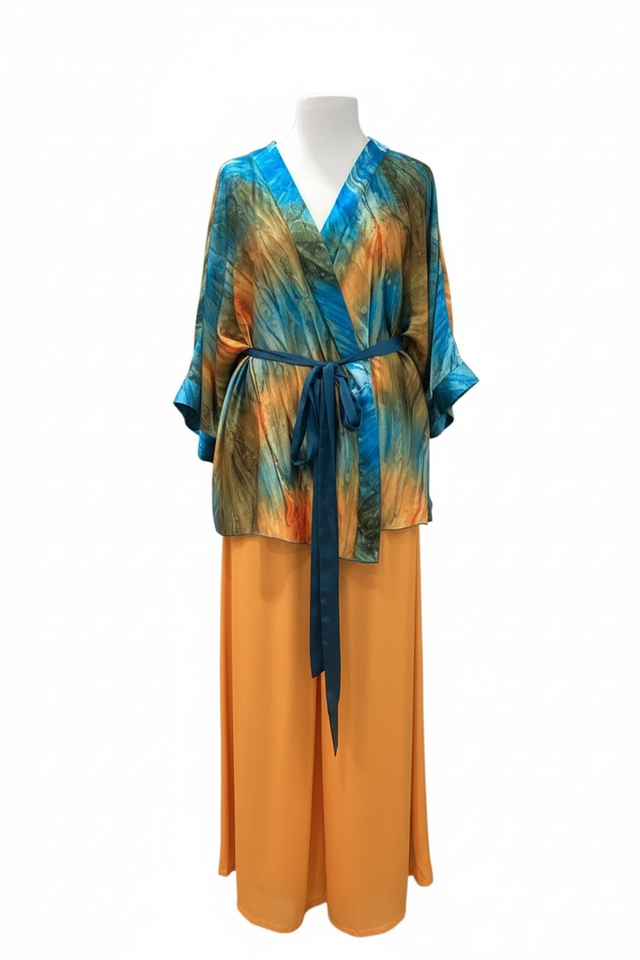 Son imprimé tie & dye bleu, vert et jaune orangé, lumineux et artistique, apporte une allure moderne et expressive. Porté ici avec un pantalon fluide, il devient une pièce élégante du quotidien comme des grands moments, tout en conservant une sensation de légèreté et de douceur au contact de la peau.